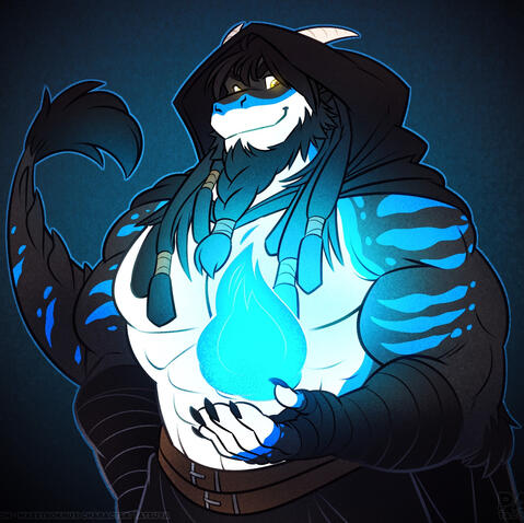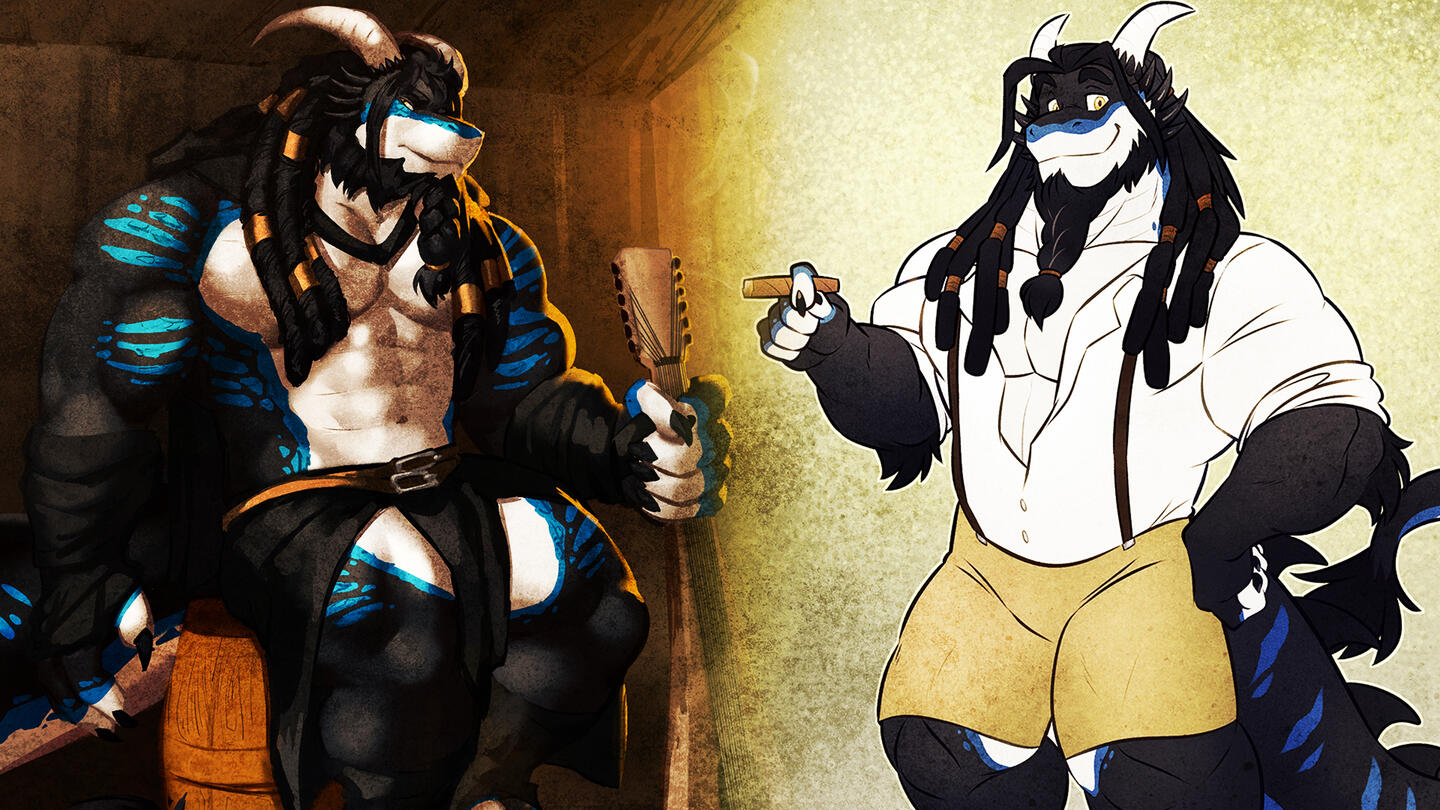 Tatsuya was born in the celtic lands of Ireland after given birth by his parents who are both draconic athro-kins, his mother providing more megalodonic genes. At a young age, he always enjoyed music as he sometimes snuck into taverns late night where his father would be drinking with his fellow townspeople. It is there where he found the inspiration to pick up an instrument to not only entertain, but to become a storyteller through his music.Unfortunately, his aspirations on solely being a storyteller would come short, as a great war erupted within his region, forcing the aquatic dragon to become apart of his colony's infantry at the age of 19. While keeping his visions strong with being a musician, Tatsuya was content with putting it aside as a hobby with becoming one of the king's hand picked knights as his main profession. he'd server as a knight for his colony until he reached the age of 35.It was around that time when he noticed tyranny and corruption occurring within the royal ranks of those he served. The rulers became more fascist and power hungry, making decisions that not only hurts innocent communities outside of their territories, but those on the inside. While there were a handful that recognized the warnings, the hierarchy was too powerful to combat without dealing with serious consequences. This is when Tatsu opted to resign and withdrawn from being a knight-yet Tatsu's former king forbid it.The king felt that Tatsu was one of his best wielders and weapons during conflict and there wasn't anyone else to replace him. If Tatsu were to quit, his former king would place him as a traitor to his country. Knowing what he faced, he had no choice but to risk becoming an outcast to his people outing the king and his followers as vile, power hungry false leader. His actions caused Tatsuya to be wanted fugitive who left and escaped his country and is still considered to be on the run.For the last 15 years, Tatsu remain hidden from his former kingdom as the tyrant of a king still controls that region. During this time, Tatsu started to make a shift to his combat style. While he still holds a mastery with wielding a sword, he achieved new knowledge by becoming a mage, conjuring the power of blue magic. Tatsu felt compelled to add to his already skillful combat efficiency, providing a substantial increase to his survivability. He now travels and lives on the go, never staying in one spot in fear of causing a village or more to be under fire if located. So far, the word for his arrest has been put to rest as it's been many years since he's been seen by anyone from his former region, allowing him to return to his favorite hobby of being a traveling bard.